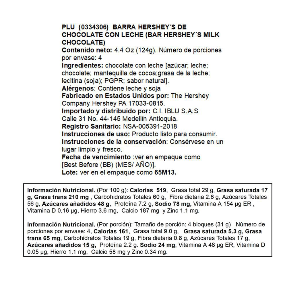 Barra de chocolate HERSHEYS leche y chocolate (124 gr)